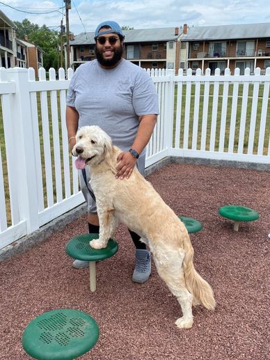 I first met Stanley around his third birthday, him having completed two and a half years of training with New Hope Assistance Dogs out of Warren, PA. Stanley I think naturally has a buoyant and charming personality, but the training from New Hope really made him what he is: a great service dog. Everywhere I go, people are in awe of Stanley's looks, his behavior, his demeanor, and his service and loyalty to me. Stanley won't leave my side and he lives to please me, his owner. Last night, for example, I had a combat related nightmare (I was deployed to Iraq with the Army in '06 - '07 and have been diagnosed with clinical PTSD) and I turned to Stanley to help ease me out of my subsequent panic attack. I laid on the floor next to Stanley and he proceeded to "comfort me" - licking my hands and face profusely, then leaning his 85 lb. body on me and laying his head on my shoulder. My panic attack ended and I forgot about my nightmare and fell asleep. It didn't surprise me at all. Since I first got Stanley a month ago, I have gone from 2-3 severe panic attacks per day (caused by stress or loud noises) - to about one every 2 weeks. I can't necessarily explain the science behind it, or specify why Stanley has helped me so much - all I can say is that before I got Stanley from New Hope, I wasn't even considering going back to work. 3 days after getting him, I called my wife and said - for the first time in months, I'm completely confident that I will be going back to work and soon. Now I'm working, going out to restaurants and enjoying loud, crowded social events with Stanley and not having panic attacks. It was interesting to observe the effect that Stanley has had on me. Over this past weekend, I took my family out Ice Skating and then to see the model trains - because I didn't have a place for Stanley to be with me while ice skating, I left him at home. After ice skating when we went to the model trains, we were packed into the historic (small and cramped) train station looking at the model trains with the kids and the door slammed. I had my first loud noise related panic attack since I first got Stanley a month ago! I immediately told my wife we needed to go home and check on Stanley - but it was really because I missed him and his calming influence on me. Stanley has barely left my side since he's been with me and I haven't had a panic attack from loud noise. The only event I've been to without him has one loud noise and I have a panic attack (shaking and dissociating) right there in the train station. I really attribute the reduction in symptoms to Stanley's calming influence on me. Thank you New Hope - you and Stanley have given me New Hope!